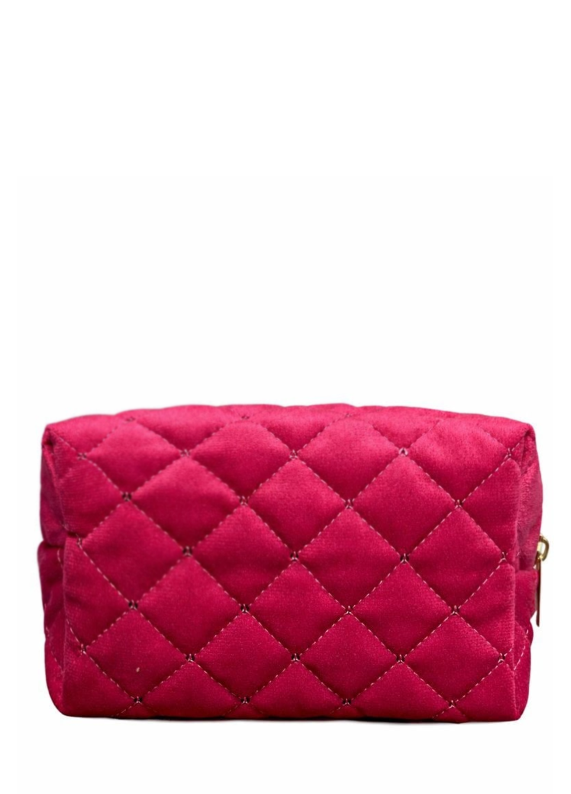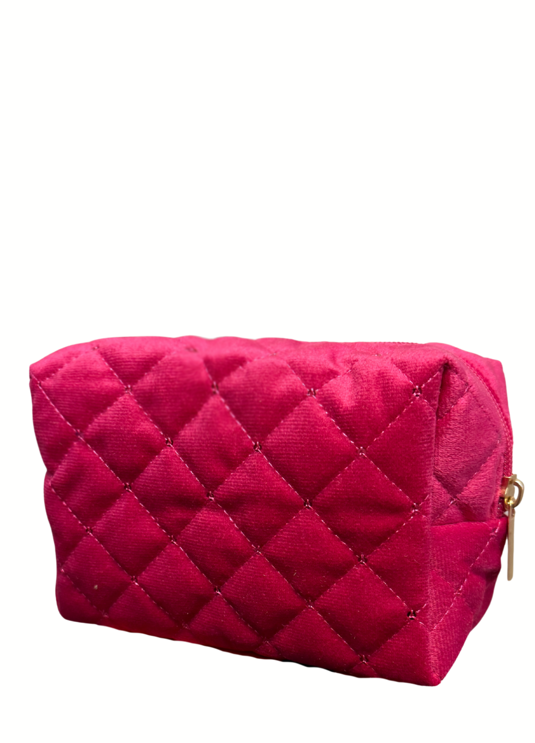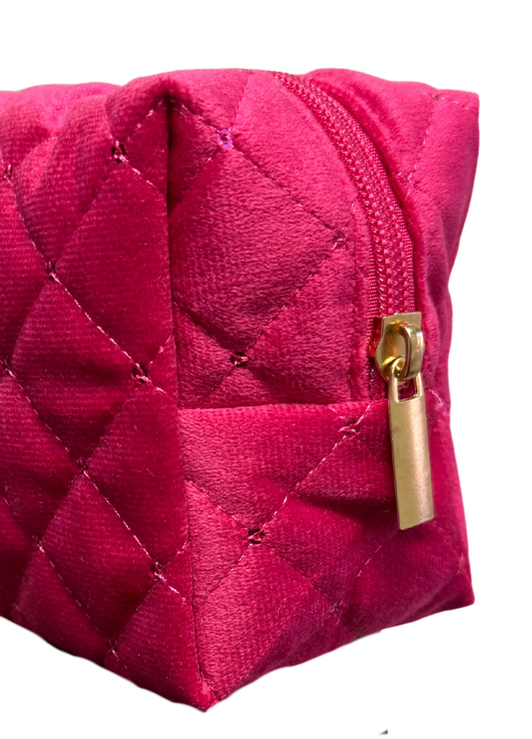 Add a little luxury to your everyday routine with this stunning quilted cosmetic bag. Designed in a rich fuchsia velvet with a chic diamond-stitch pattern, this bag is both stylish and functional. It’s the perfect size to hold daily makeup and skincare must-haves!